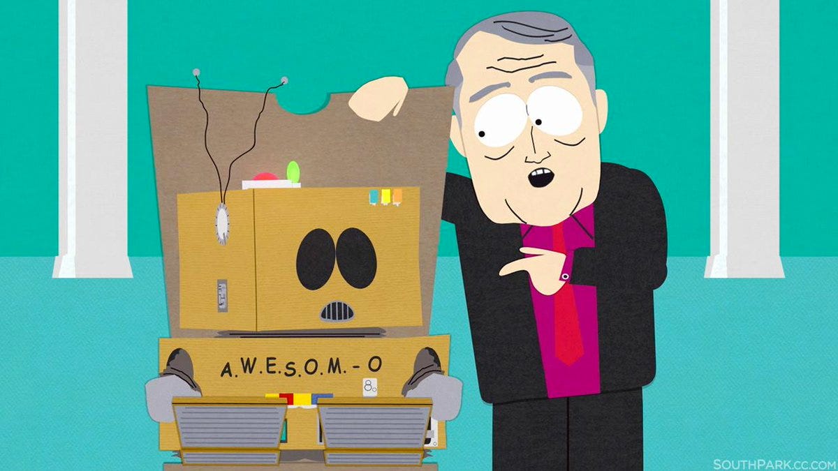 In this episode of South Park, Cartman dresses up as a robot to prank his classmate Butters only to have to keep the ruse going when he discovers Butters has incriminating footage of Cartman. This leads them to Hollywood where executives think that AWESOM-O is a real robot and can spit out ideas.